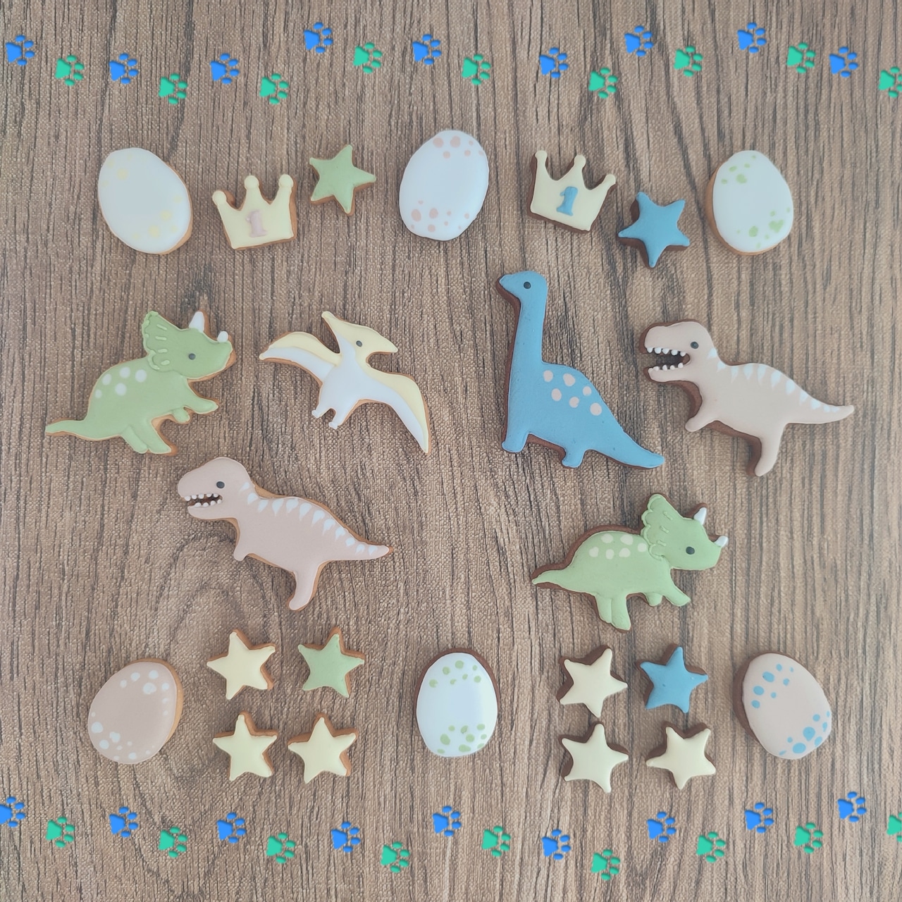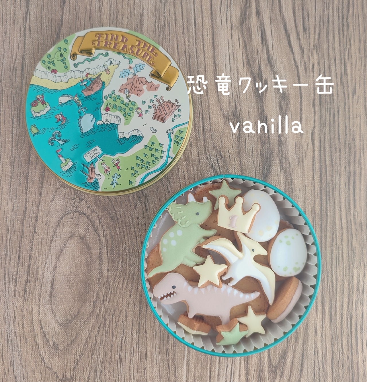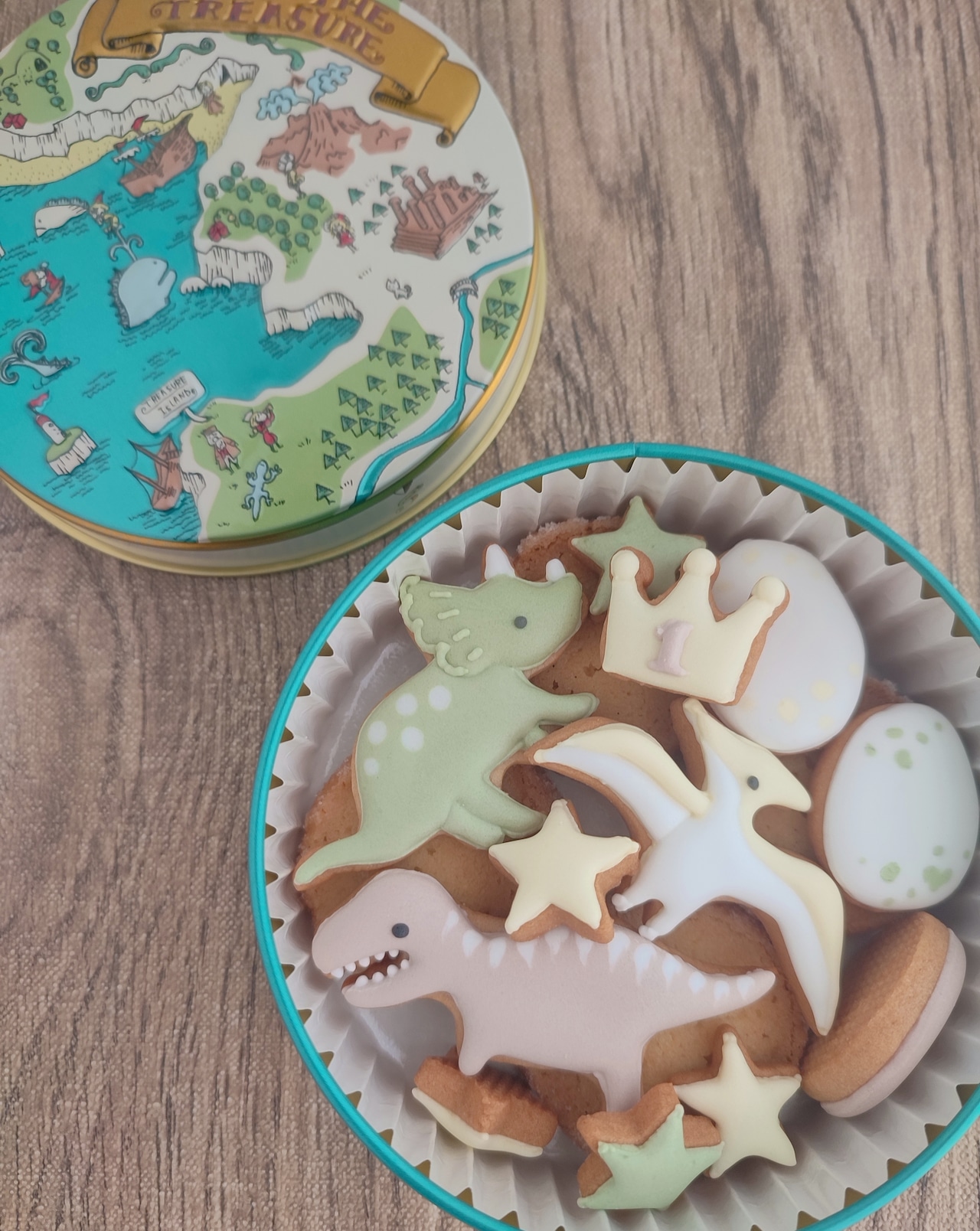 可愛いアドベンチャー缶に、恐竜のアイシングクッキーとバニラ風味のディアマンクッキーを詰めました。